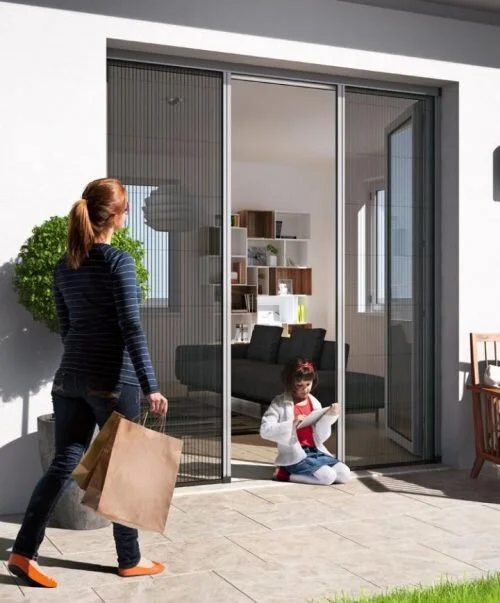 Our retractable flyscreen solution is great for wide openings and easy to use when entertaining Alfresco style. Pleated Screens are a beautiful innovation that wonβt spoil your views and are built to last! This product is great for openings up to 9 metres wide and retracts into a discrete housing. It can be installed beside or inside your existing door.